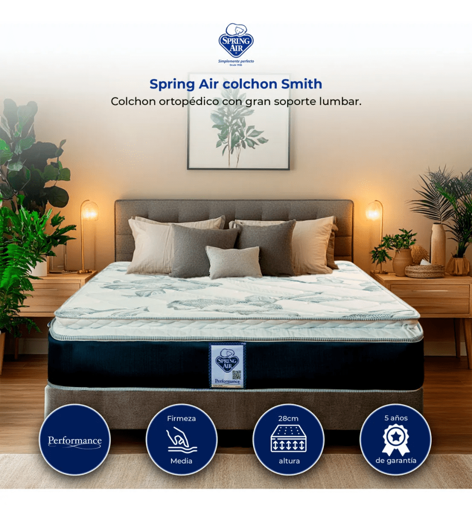 4. Colchón Individual Spring Air Smith Tecnología Performance Colchon Ortopédico Gran Soporte Lumbar 28 cm de Altura Firmeza Media